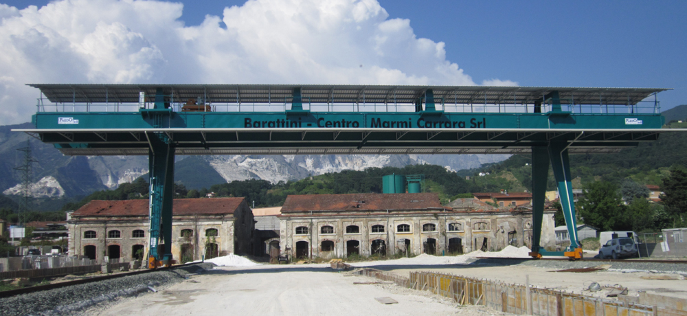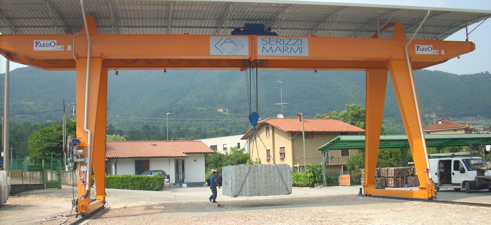 Officina Faedo also manufactures gantry Torsional cranes with structure with single beam and two legs to allow the load to turn 90 degrees near the lateral leaps .